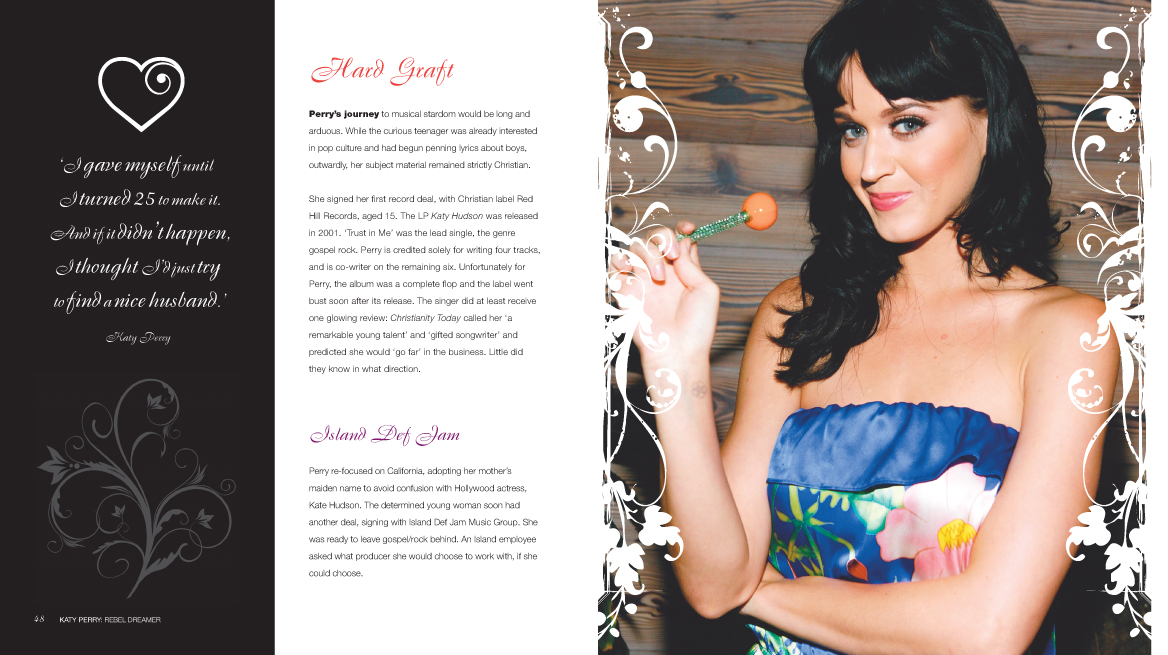 The visually stunning Katy Perry: Rebel Dreamer is an unofficial biography by Alice Hudson. Katy Perry is adored by a huge online community and has sold more than 22 million digital tracks and mobile products worldwide. Having rocketed from sheltered, gospel-singing teenager Katheryn Elizabeth Hudson, to international pop goddess, who kissed a girl and liked it, Perry wows the world with her outfits (crazy, provocative, fruit-themed, vintage), straight-talking lyrics and crackling energy.