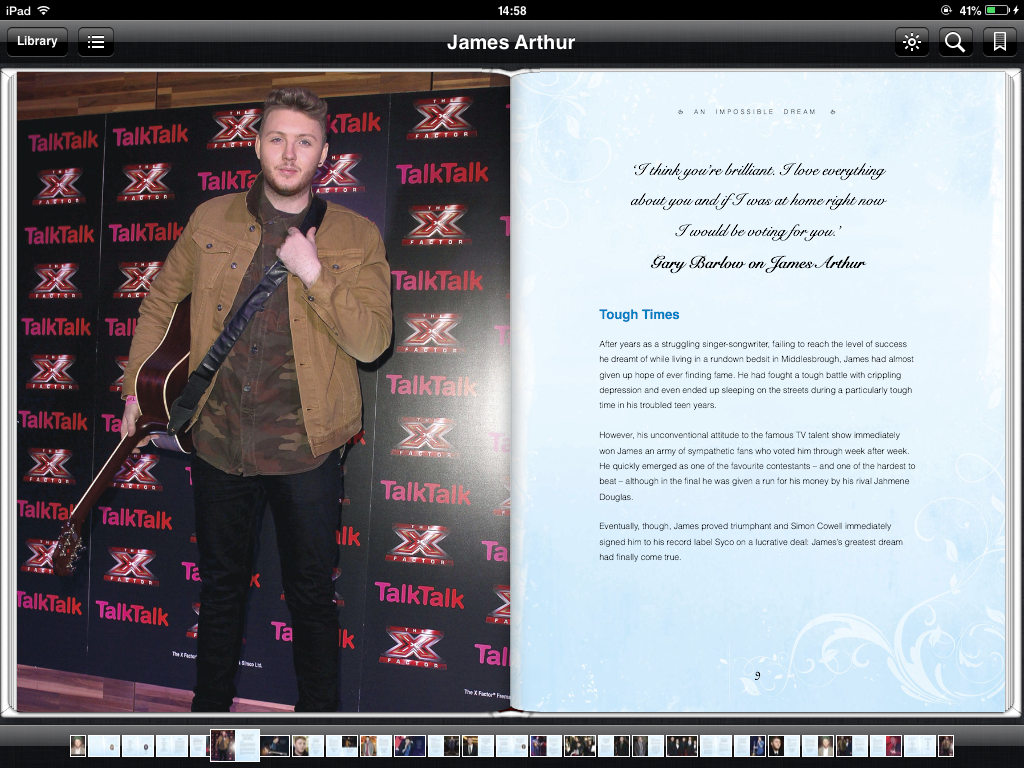 We’ve just launched our new Full-colour illustrated ebook on the iBook store and soon on Kobo: part of a brilliant new digital series for iPad, iPhones and the desktop OSX Mavericks OS. The ninth winner of The X-Factor, James Arthur’s debut single ‘Impossible’ has become the fastest-selling X Factor winner’s single so far. Amazing images and inspirational text tell the story of James Arthur’s climb to fame. Packed with amazing photos.